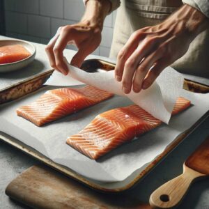 2. Prepare the Salmon: Pat the salmon fillets dry with paper towels. Place them on a baking sheet lined with parchment paper or foil.