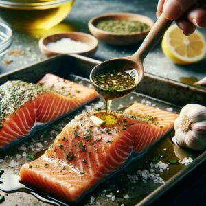 3. Season the Salmon: In a small bowl, whisk together olive oil, lemon juice, garlic, and herbs. Brush this mixture over the salmon fillets. Season with salt and pepper.