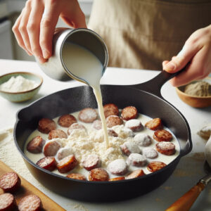 - Description: Sprinkle flour over the sausage. Stir and cook for 2 minutes. Gradually whisk in milk. Cook until thickened. Season with salt and pepper.