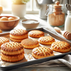 - Description: Bake the cut-out biscuits until they are golden brown.