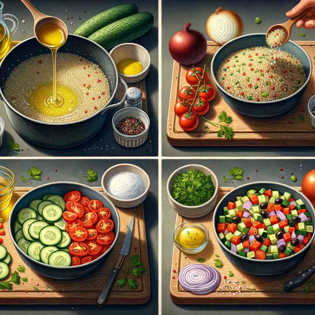 4. Combine Ingredients: In a large bowl, mix the cooled quinoa with the vegetables. Pour the dressing over the salad and toss to combine.