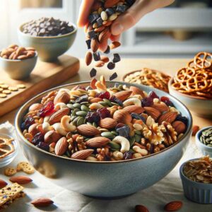 Trail mix is a highly customizable and portable snack that’s perfect for hikes, travel, or as a quick energy booster. Typically, it includes a mix of nuts, seeds, dried fruits, and sometimes chocolate or sweets, providing a satisfying balance of sweet, salty, and crunchy.